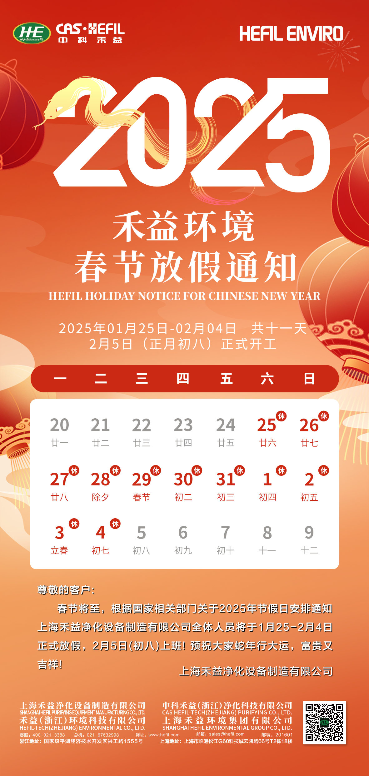 您好,正值2025年春節假期來臨之際,禾益環境全體員工向您致以最衷心的新年祝福,感謝您一直以來對我們公司的信任與支持,現將我司放假安排公布如下: